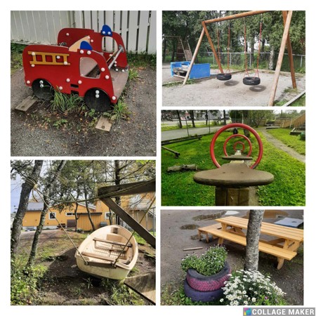 På uteområdet vårt har vi et leketårn i lav høyde som passer både til store og små. På framsiden har vi huskestativ for de minste, humpedisse og en litt større sklie har en større sklie. Vi har en Båt på baksiden av uteområdet vårt. Den brukes til mye forskjellig typer lek. Eksempelvis: familelek, reising til ulike steder, bølger på havet, sjørøverlek eller sang. Vi har flere sandkasser på området både på framsiden og baksiden av barnehagen. Vi har også et turområde i gangavstand til barnheagen hvor vi har egen gapahuk, bålplass og klatrenett.